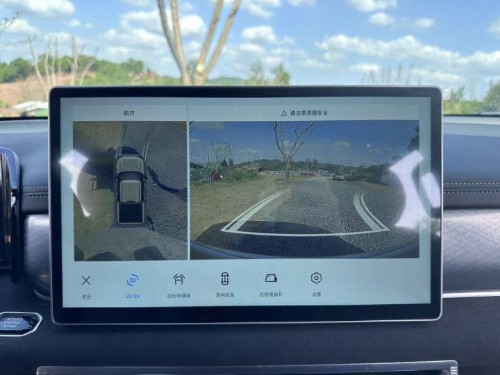除此之外,顶配车型还搭载了全系标配的540影像,包括透明底盘、透明引擎盖和拖车影像,双屏联动的设计,让车辆姿态、外部路况尽收眼底。在山路会车或者通过狭窄路段时,透明底盘功能能清晰看到车轮下方的障碍物,彻底解决了皮卡车身宽大、视野盲区大的痛点,即便是新手司机,也能轻松驾驭这台尺寸不小的皮卡。